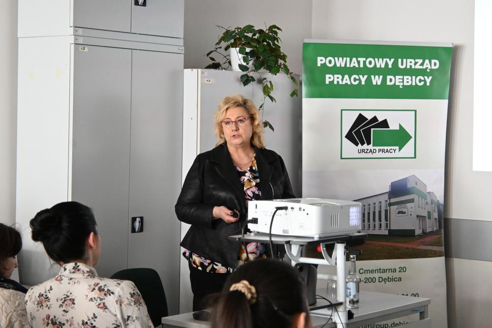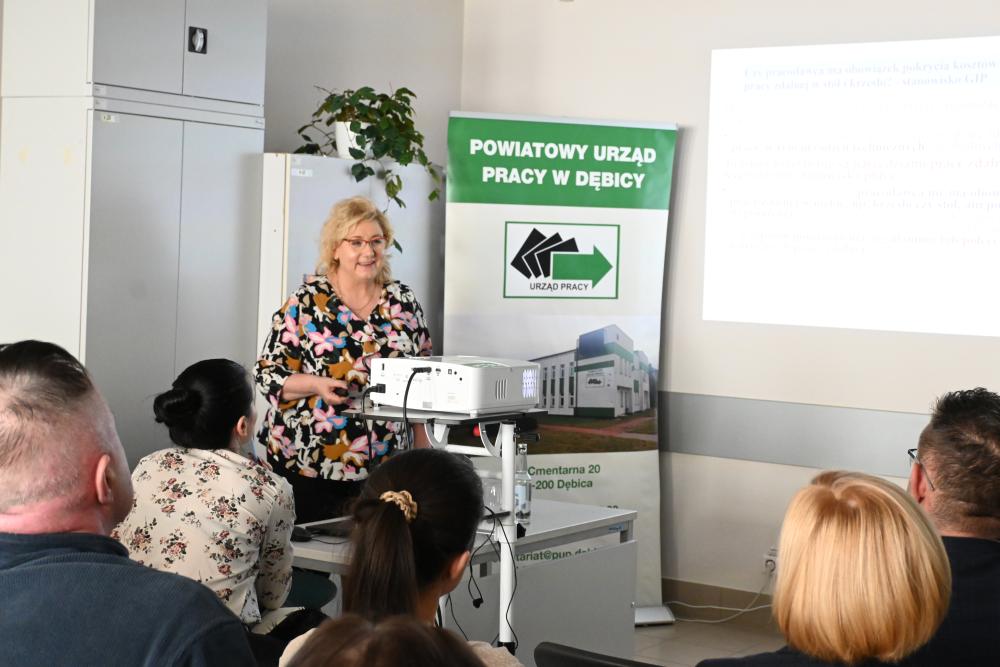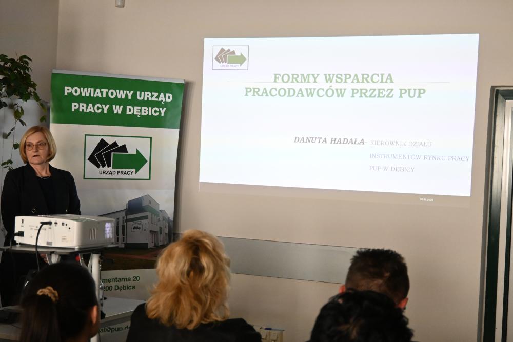 Pani Danuta Hadała, Kierownik Działu Instrumentów Rynku Pracy Powiatowego Urzędu Pracy w Dębicy omówiła najważniejsze formy wsparcia oferowane pracodawcom przez tut. urząd pracy w 2025 r.