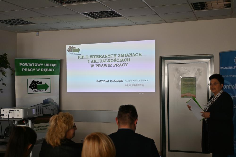 W drugiej części spotkania pani Barbara Czarnek, Nadinspektor pracy z Okręgowego Inspektoratu Pracy w Rzeszowie zaprezentowała wybrane zmiany i aktualności w prawie pracy dla pracodawców i pracowników m.in. regulacje dot. sygnalistów, wyposażenia stanowiska pracy w monitory ekranowe, zmiany w KPC w zakresie prawa pracy, dyrektywę work-life balance.